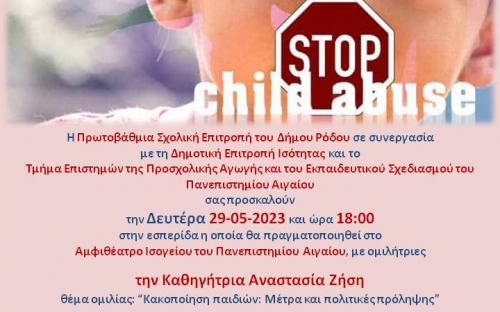 Στο πλαίσιο αυτό, με την αρωγή του Δημάρχου Ρόδου κ. Αντώνη Β. Καμπουράκη και τη συνεργασία του Πρόεδρου Πρωτοβάθμιας Σχολικής Επιτροπής του Δήμου Ρόδου και Προέδρου του ΤΕΠΑΕΣ Πανεπιστημίου Αιγαίου Καθηγητή Παναγιώτη Ι. Σταμάτη και της Εντεταλμένης Δημοτικής Συμβούλου για θέματα Ισότητας και Προέδρου της Δημοτικής Επιτροπής Ισότητας κα. Ευδοκίας Αποστολίδη – Πάττα διοργανώνεται εσπερίδα με τίτλο: «Λέμε ΟΧΙ στην παιδική κακοποίηση» τη Δευτέρα 29-05-2023 και ώρα 18:00 στο Αμφιθέατρο Ισογείου του Πανεπιστημίου Αιγαίου.
