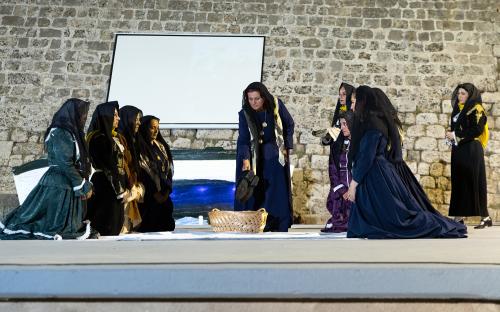 Μεγάλο Μνημόσυνο η παράσταση στη Μεσαιωνική Τάφρο. Δέηση, υπέρ της ψυχής των χιλιάδων πνιγμένων σφουγγαράδων, θαμμένων στην άμμο ή αφημένων στην αφρικανική θάλασσα. Μνημόσυνο στις γυναίκες που εγκατέστησαν στα σωθικά τους τη διττή ιδιότητα του πατέρα και της μάνας. Δέηση, για τον αείμνηστο καθηγητή μας Θεόφιλο Κλωνάρη, μαθητή της Δόρας Στράτου, που εμπνεύσθηκε και δημιούργησε τον Χορό του Μηχανικού.