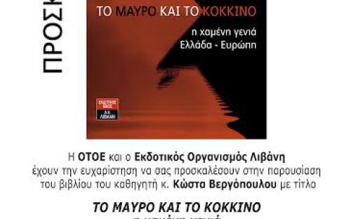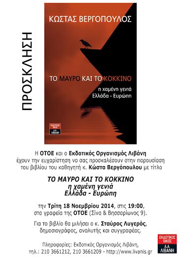 Η ΟΤΟΕ και ο Εκδοτικός Οργανισμός Λιβάνηέχουν την ευχαρίστηση να σας προσκαλέσουν στην παρουσίασητου βιβλίου του καθηγητή κ. Κώστα Βεργόπουλου με τίτλο ΤΟ ΜΑΥΡΟ ΚΑΙ ΤΟ ΚΟΚΚΙΝΟη χαμένη γενιάΕλλάδα - Ευρώπητην Τρίτη 18 Νοεμβρίου 2014, στις 19:00,στα γραφεία της ΟΤΟΕ (Σίνα & Βησσαρίωνος 9).Για το βιβλίο θα μιλήσει ο κ. Σταύρος Λυγερός,δημοσιογράφος, αναλυτής και συγγραφέας.