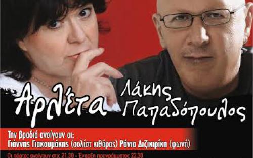 - Άλλωστε τι κι αν μετρά σχεδόν 50 χρόνια στο τραγούδι; Η πολυτάλαντη Αρλέτα, επιφυλάσσει πάντα μία έκπληξη, στην τέχνη, όπως και στη ζωή. Όταν δε έχει στην... πλάτη της τον αγαπημένο της Λάκη Παπαδόπουλο, οι αισθήσεις απογειώνονται και κάθε όριο στη μουσική εμπειρία που χαρίζουν, καταργείται. Το έχουν αποδείξει από την αρχή της συνεργασίας τους, με τις αμέτρητες επιτυχίες τους. Θα το αποδείξουν για άλλη μια φορά επί σκηνής.