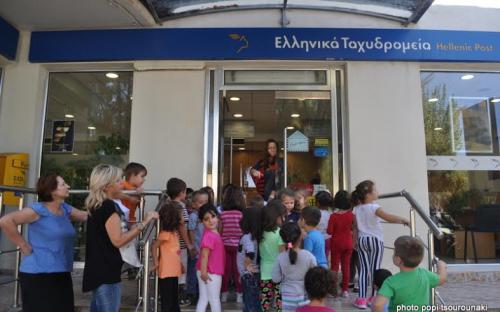 - Στόχος της δράσης ήταν η διερεύνηση και η προώθηση της κατανόησης του κόσμου που τα περιββάλλει καθώς και η αλληλεπίδραση τους με τον κοινωνικό περίγυρο. Οι υπάλληλοι του Ταχυδρομείου υποδέχτηκαν τα παιδιά με χαμόγελο και με μεγάλη χαρά τους μίλησαν για τους τρόπους αποστολής αλλά και παραλαβής γραμμάτων και δεμάτων, έδειξαν και εξήγησαν πως λειτουργούν οι ταχυδρομικές θυρίδες και τέλος τους χάρισαν γραμματόσημα για να στείλουν και αυτά το δικό τους "γράμμα."