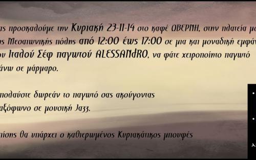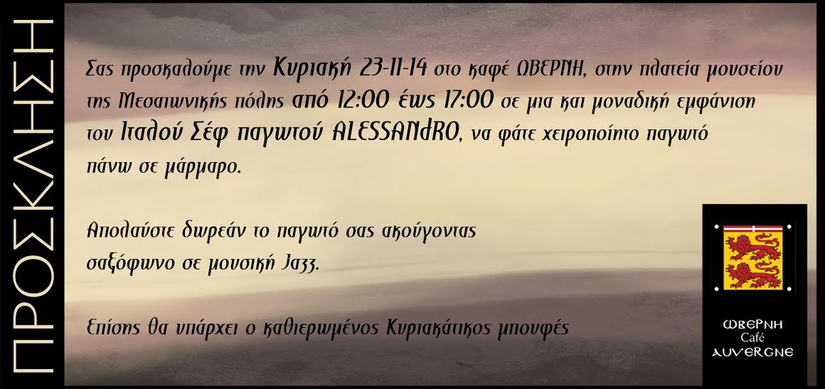 - ΑΠΟΛΑΥΣΤΕ ΤΗΝ ΕΡΧΟΜΕΝΗ ΚΥΡΙΑΚΗ 23 ΝΟΕΜΒΡΙΟΥ ΑΠΟ 12.00 ΕΩΣ 17.00, ΠΑΓΩΤΟ ΣΕ ΜΑΡΜΑΡΟ - ΔΙΑ ΧΕΙΡΟΣ ΤΟΥ ΙΤΑΛΟΥ ΣΕΦ ΠΑΓΩΤΟΥ ALESSANDRO!