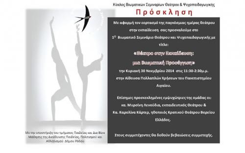 Το 1ο Βιωματικό Σεμινάριο Θεάτρου και Ψυχοπαιδαγωγικής με τίτλο: «Θέατρο στην Εκπαίδευση: μια Βιωματική Προσέγγιση», θα πραγματοποιηθεί την Κυριακή 30 Νοεμβρίου 2014, στις 11:30-2:30μ.μ., στην Αίθουσα Χορού του Πανεπιστημίου Αιγαίου, (είσοδος από τις καμάρες) με αφορμή τον εορτασμό της παγκόσμιας ημέρας θεάτρου στην εκπαίδευση.Επίσημες προσκεκλημένες εμψυχώτριες της ομάδας τις κ.κ. Μυρσίνη Λενούδια, εκπαιδευτικό Θεάτρου και Καρολίνα Κάρτερ, ηθοποιό Κρατικού Θεάτρου Βορείου Ελλάδος. Το σχεδιασμό του Κύκλου Βιωματικών Σεμιναρίων υποστηρίζουν επιστημονικά και οργανωτικά οι: