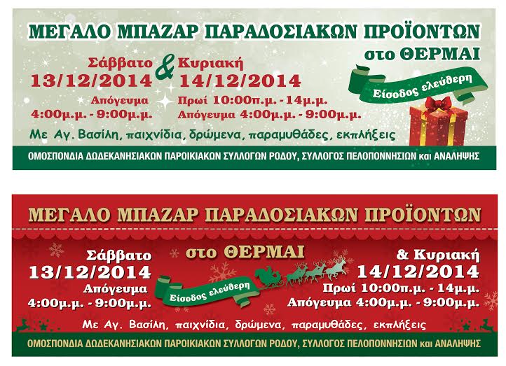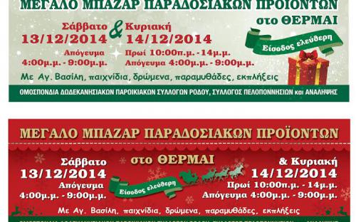 • ΣΑΒΒΑΤΟ ΚΑΙ ΚΥΡΙΑΚΗ - 13 ΚΑΙ 14 ΔΕΚΕΜΒΡΙΟΥ ΜΕΓΑΛΟ ΜΠΑΖΑΡ ΠΑΡΑΔΟΣΙΑΚΩΝ ΠΡΟΪΟΝΤΩΝ ΣΤΟ ΘΕΡΜΑΙ.