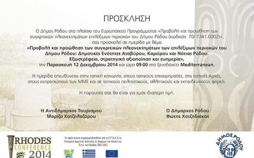 «Προβολή και προώθηση των συγκριτικών πλεονεκτημάτων των επιλέξιμων περιοχών του Δήμου Ρόδου: Δημοτικές Ενότητες Αταβύρου, Καμείρου και Νότιας Ρόδου. Εξωστρέφεια, στρατηγική αξιοποίηση, ευημερία», την Παρασκευή 12 Δεκεμβρίου 2014 και ώρα 09:00, στο ξενοδοχείο Mediterranean».