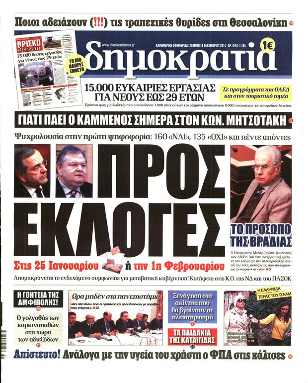 «Αγώνας δρόμου για 20 βουλευτές σε 11 ημέρες» είναι ο τίτλος του Ελεύθερου Τύπου που γράφει «το προφανές πολιτικό συμπέρασμα από τη χθεσινή πρώτη ψηφοφορία για την προεδρική εκλογή είναι ότι η πιθανότητα για εθνικές εκλογές στις 25 Ιανουαρίου ισχυροποιείται». Στο ίδιο μήκος κύματος η Καθημερινή που κυκλοφορεί με τίτλο «20 ψήφοι για Πρόεδρο ή κάλπες».