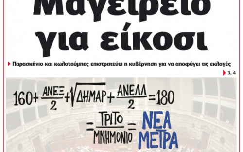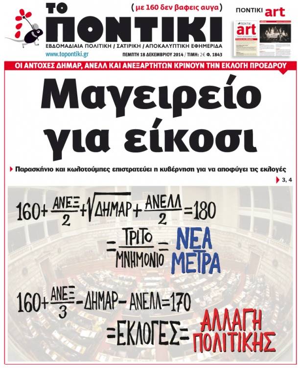 Με τίτλο «Μαγειρείο για είκοσι» κυκλοφορεί το Ποντίκι που γράφει ότι «η πολιτική αριθμητική, όπως και να γίνουν οι προσθαφαιρέσεις, είναι αμείλικτη για τον Σαμαρά και οι 180 δεν μαζεύονται στην τρίτη ψηφοφορία παρά μόνον εάν κάνουν διπλή κυβίστηση, κοινώς «κωλοτούμπα», και ταυτοχρόνως «διαλυθούν» οι γραμμές των ΑΝΕΛΛ και της ΔΗΜΑΡ». Στο πρωτοσέλιδο η εφημερίδα φροντίζει να λύσει και τις εξισώσεις...