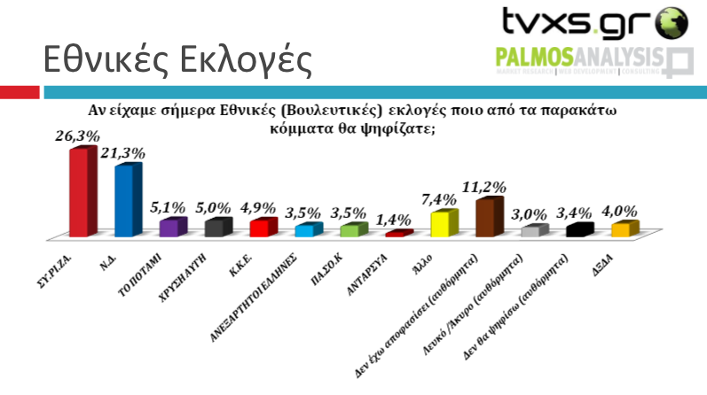 Ειδικότερα στην πρόθεση ψήφου ο ΣΥΡΙΖΑ συγκεντρώνει 26,3% και η ΝΔ 21,3%. Τρίτο κόμμα είναι το Ποτάμι με 5,1% και ακολουθούν η Χρυσή Αυγή με 5%, το ΚΚΕ με 4,9%, οι Ανεξάρτητοι Έλληνες με 3,5%, το ΠΑΣΟΚ με 3,5% και η ΑΝΤΑΡΣΥΑ 1,4%. Άλλο κόμμα δηλώνει το 7,4%, ενώ η αδιευκρίνιστη ψήφος -με αυθόρμητη απάντηση- ανέρχεται στο 11,2%. Το 3% δηλώνει λευκό ή άκυρο, ενώ 3,4% των ερωτηθέντων απαντάει πως δεν θα ψηφίσει.