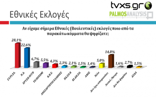 Πρώτος στην πρόθεση ψήφου παραμένει ο ΣΥΡΙΖΑ, με την ψαλίδα να μειώνεται στις 5,5 μονάδες από 7,5 που ήταν στην τελευταία δημοσκόπηση του TVXS, την προηγούμενη εβδομάδα. Στη μέτρηση της Palmos Analysis ο ΣΥΡΙΖΑ συγκεντρώνει ποσοστό 28,1% έναντι του 22,6% της ΝΔ. Ακολουθούν η Χρυσή Αυγή με 6,7%, το Ποτάμι με 5,5% και το ΚΚΕ με 4,3%. Κάτω από το όριο του 3% εμφανίζονται οι Ανεξάρτητητοι Έλληνες με 2,3%, το ΠΑΣΟΚ με 2,1%, το Κίνημα Δημοκρατών Σοσιαλιστών του Γιώργου Παπανδρέου που συγκεντρώνει 1,5% και το ΛΑΟΣ με 1,4%.