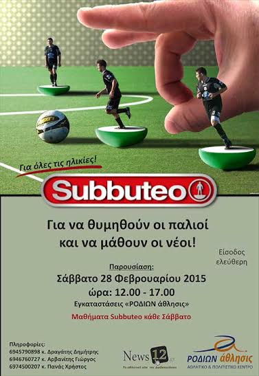 Το Subbuteo και πάλι στη Ρόδο! Οι λάτρεις του επιτραπέζιου ποδοσφαίρου θα έχουν την ευκαιρία να ξεδιπλώσουν και πάλι τις ικανότητες τους και να θυμηθούν τα παλιά παίζοντας αυτό που έμαθαν από μικροί, το Subbuteo. Το Ροδίων Παιδεία έχει ανοίξει τις πύλες του σε μια ομάδα ρομαντικών παικτών τους οποίους και φιλοξενεί κάθε Σάββατο στις εγκαταστάσεις του. Στην αίθουσα που βρίσκεται ακριβώς δίπλα από το κολυμβητήριο, πέντε οργανωμένα τραπέζια (αγωνιστικών προδιαγραφών) είναι πανέτοιμα για να υποδεχθούν τους παλιούς παίκτες αλλά και βεβαίως και αυτούς που θέλουν να το γνωρίσουν από κοντά. Σας περιμένουμε όλους (ανεξαρτήτου ηλικίας) το Σάββατο 28 Φεβρουαρίου από τις 12μ. έως και τις 5μ.μ. για μια παρουσίαση όλων των μυστικών του Subbuteo.
