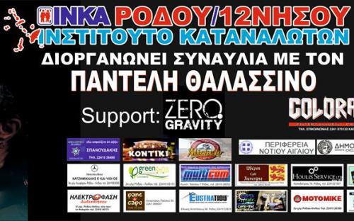 Στο πλαίσιο προγραμματισμένων και στοχευμένων δράσεων και προκειμένου, το Ινστιτούτο Καταναλωτών Ρόδου Δωδεκανήσου να προσφέρει ποιοτικές εκδηλώσεις στους Δωδεκανήσιους και τους επισκέπτες των νησιών μας, προσκάλεσε το δημοφιλή καλλιτέχνη Παντελή Θαλασσινό, και την πενταμελή ορχήστρα του, για μια αξέχαστη, μουσική εκδήλωση.