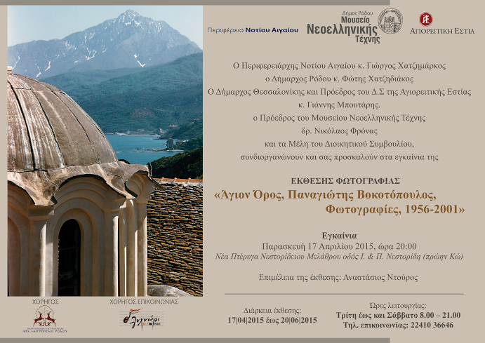 Ο Πρόεδρος και τα Μέλη του Δ.Σ του Μουσείου Νεοελληνικής Τέχνης του Δήμου Ρόδου, με ιδιαίτερη χαρά ανακοινώνουν τα εγκαίνια της έκθεσης φωτογραφίας του Ακαδημαϊκού Παναγιώτη Βοκοτόπουλου. Θα τελεστούν την Παρασκευή 17 Απριλίου και ώρα 20.00 στη Νέα πτέρυγα του Νεστορίδειου Μελάθρου. Το φωτογραφικό υλικό προέρχεται από το αρχείο του κ. Παναγιώτη Βοκοτόπουλου ο οποίος επισκέφθηκε το Άγιον Όρος πολλές φορές μέσα στο διάστημα από το 1956 έως το 2001.