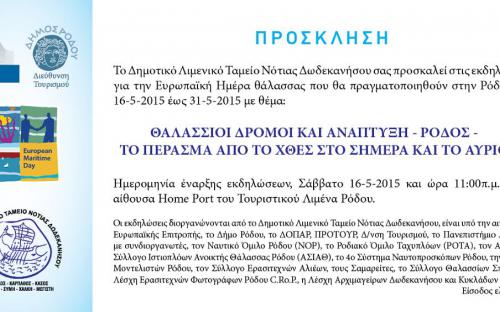 Στις 16,17,23,24,30 και 31 Μαΐου 2015, η Ρόδος διοργανώνει μια σειρά από εκδηλώσεις αφιερωμένες στην Ευρωπαϊκή Ημέρα Θάλασσας, αναδεικνύοντας την στενή της σχέση με το θαλάσσιο περιβάλλον που καθόρισε η γεωπολιτική της θέση και σημασία.