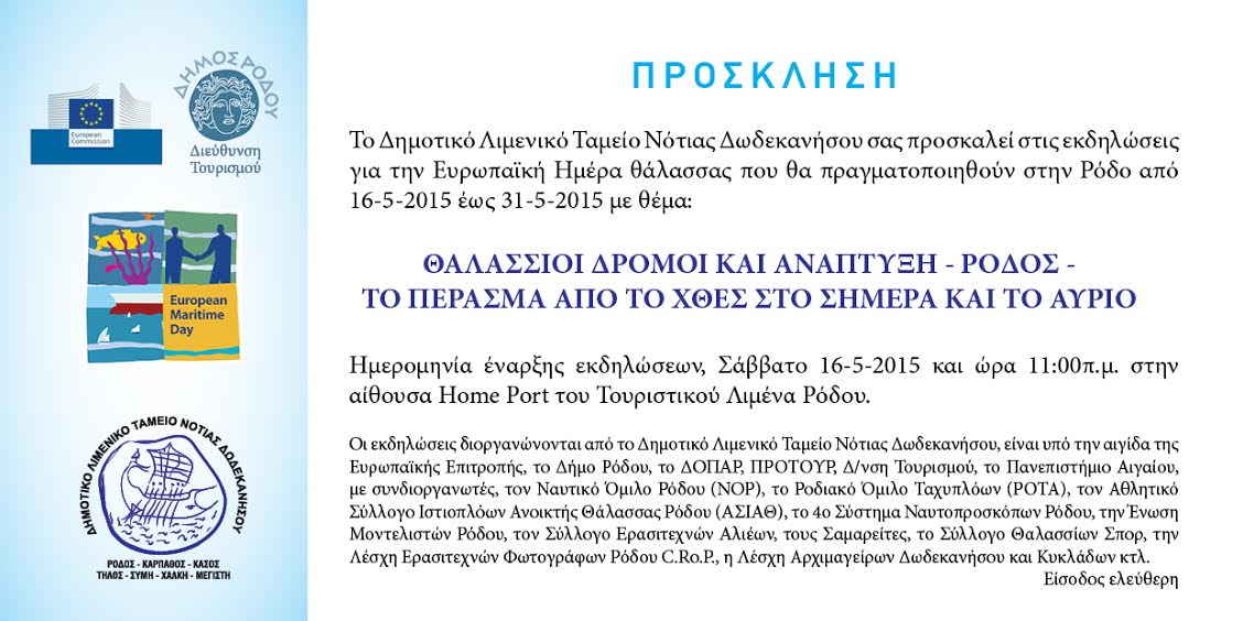 Το Δημοτικό Λιμενικό Ταμείο Νότιας Δωδεκανήσου σας καλεί στις εκδηλώσεις για την Ευρωπαϊκή Ημέρα θάλασσας που θα πραγματοποιηθούν στην Ρόδο το Μάιο του 2015 με θέμα