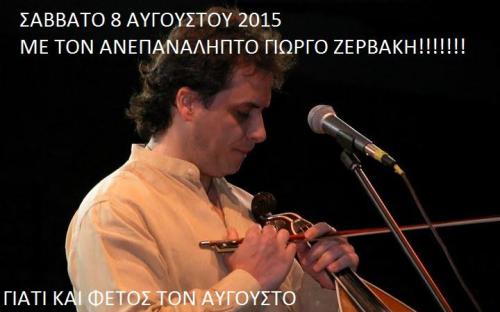 Για ένα κρητικό-λαικό-νησιώτικο γλέντι μέχρι το πρωί μαζί μας ο δεξιοτέχνης λυράρης ΓΙΩΡΓΟΣ ΖΕΡΒΑΚΗΣ και η παρέα του που μας υπόσχονται ένα μεθυστικό γλέντι. Θα παντρέψουμε αρμονικά δωδεκανησιακά ακούσματα και κρητικούς ήχους με σκοπό να κρατηθούμε στην πίστα μέχρι το ξημέρωμα της νέας μέρας. Επίσης μαζί μας θα βρίσκονται το χορευτικό συγκρότημα του Π.Σ ΕΜΠΩΝΑΣ "Ο ΑΤΤΑΒΥΡΟΣ" και Η ΧΟΡΕΥΤΙΚΗ ΟΜΑΔΑ ΡΟΔΟΥ ¨ΤΟ ΧΟΡΟΣΠΙΤΟ"μαζί με το μουσικό σχήμα του Α.Μακρή.