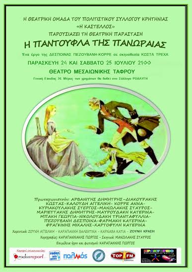 Η θεατρική ομάδα του Πολιτιστικού Συλλόγου Κρητηνίας παρουσιάζει μια μεσαιωνική κωμωδία της Δέσποινας Πεζουβάνη Κορρέ σε σκηνοθεσία Κώστα Τρέχα «Η παντούφλα της Πανωραίας». Θέατρο μεσαιωνικής Τάφρου Παρασκευή 24 & Σάββατο 25 Ιουλίου στις 9 το βράδυ. Πλούσια σκηνικά, κοστούμια και χορογραφίες καθώς και το ταλέντο των ερασιτεχνών ηθοποιών εγγυώνται μια καταπληκτική παράσταση.