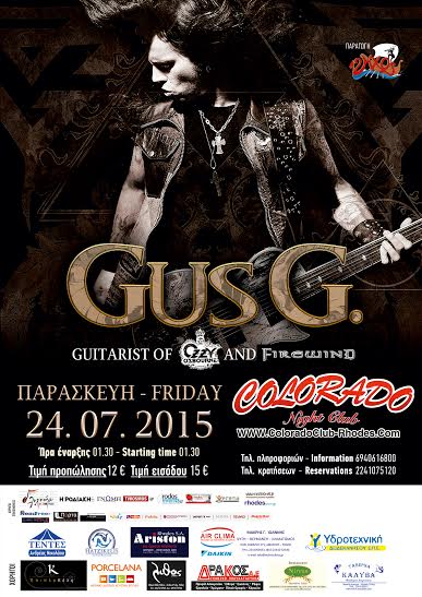 Ο Ελληνικής καταγωγής βιρτουόζος κιθαρίστας του ΟZZY OSBOURNE και των FIREWIND που αυτή τη στιγμή θεωρείται κορυφαίος στο είδος του παγκοσμίως , GUS G ζωντανά στη μουσική σκηνή του ColoradoClub την Παρασκευή 24 Ιουλίου .Μαζί του ο HENNING BASSE (Τραγουδιστής των Metalium) και ο JO NUNEZ (Drummer των Firewind).ΈναLive στα πλαίσια της Ευρωπαϊκής του περιοδεία, με αφορμή την κυκλοφορία του νέου του Αlbum "BrandNewRevolution"!!!!