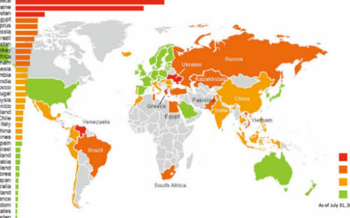 Την ίδια στιγμή, η Bank of America έχει διαμορφώσει έναν Παγκόσμιο Άτλαντα σε ένα ενεργό πολύχρωμο γράφημα που καταγράφει τις χώρες με το πιο ριψοκίνδυνο όγκο δημόσιου χρέους. Η Ελλάδα είναι «hot spot» στον χάρτη αυτό, καθώς βρίσκεται στη δεύτερη θέση κινδύνου μετά την Βενεζουέλα, με την Ουκρανία, το Πακιστάν και την Αίγυπτο να ακολουθούν. Τελευταίες στην κατάταξη επικινδυνότητας η Γερμανία, η Ελβετία, η Σουηδία, το Ηνωμένο Βασίλειο και οι ΗΠΑ.