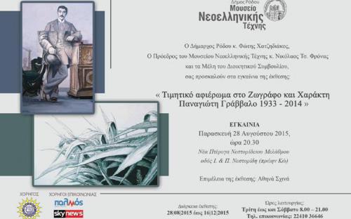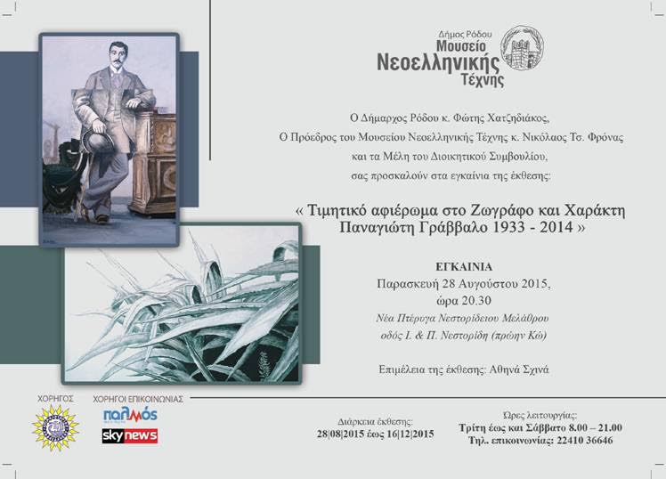 Αποφασίσθηκε λοιπόν για να τιμηθεί η μνήμη του Παναγιώτη Γράββαλου, να διοργανωθεί έκθεση με τα έργα που χάρισε στο Μουσείο μας, με το τίτλο «Τιμητικό αφιέρωμα στο ζωγράφο και χαράκτη Παναγιώτη Γράββαλο 1933- 2014». Τα εγκαίνια θα πραγματοποιηθούν την Παρασκευή 28 Αυγούστου στη Νέα Πτέρυγα του Νεστορίδειου Μελάθρου και ώρα 20.30.