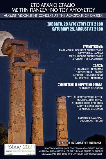 Στη Ρόδο, ο Δημοτικός Οργανισμός Πολιτισμού Αθλητισμού Ρόδου σε συνεργασία με την Εφορεία Αρχαιοτήτων Δωδεκανήσου διοργανώνει συναυλία στον αρχαιολογικό χώρο της Αρχαίας Ακροπόλεως Ρόδου το Σάββατο 29 Αυγούστου στις 21:00 με τίτλο "Στο Αρχαίο Στάδιο με την Πανσέληνο του Αυγούστου".