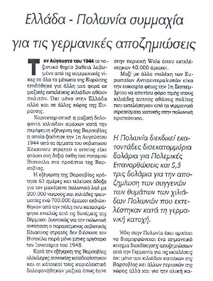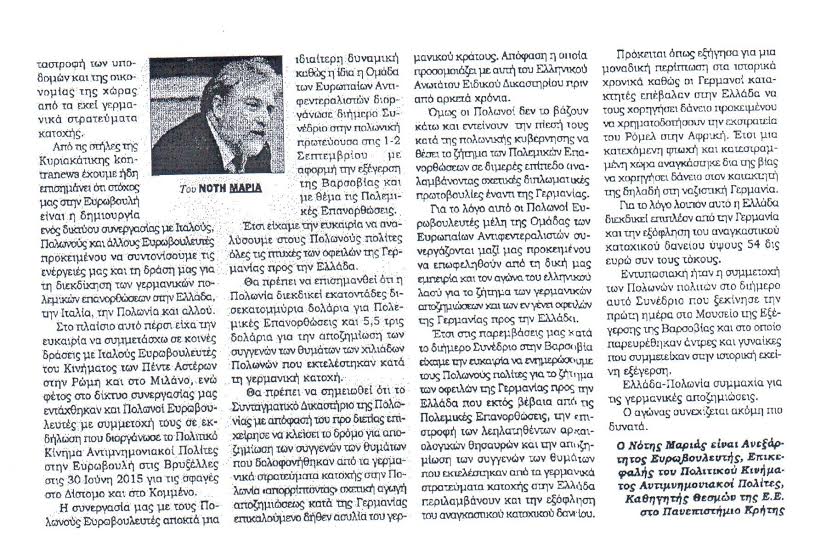 Άρθρο του Ανεξάρτητου Ευρωβουλευτή, Αντιπροέδρου των Ευρωπαίων Αντιφεντεραλιστών και Επικεφαλής του Πολιτικού Κινήματος Αντιμνημονιακοί Πολίτες Καθηγητή Νότη Μαριά που δημοσιεύτηκε στην KontraNews της Κυριακής 7/9/2015, σελ. 6 με τίτλο «Ελλάδα-Πολωνία συμμαχία για τις γερμανικές αποζημιώσεις».