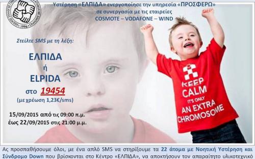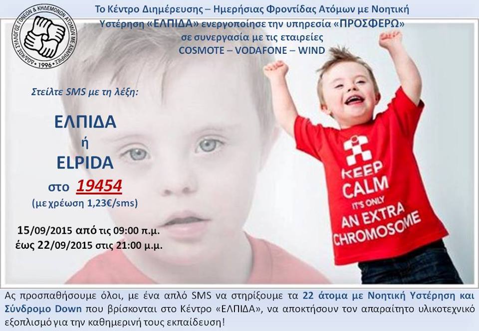 ΣΤΕΙΛΕ SMS ΜΕ ΤΗ ΛΕΞΗ - ΕΛΠΙΔΑ ή ELPIDA - ΣΤΟ 19454. ΕΤΣΙ ΣΤΗΡΙΖΕΙΣ 22 ΠΑΙΔΙΑ ΜΕ ΝΟΗΤΙΚΗ ΣΤΕΡΗΣΗ