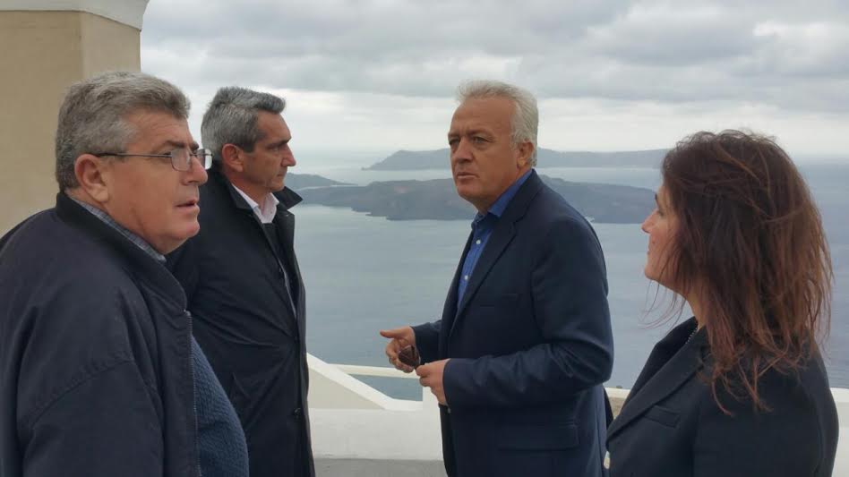 Τελικός προορισμός της περιοδείας του περιφερειάρχη η Σαντορίνη όπου και θα παραμείνει ως την Τρίτη το βράδυ, ημέρα διεξαγωγής του Περιφερειακού Συμβουλίου. Το πρωί της Κυριακής ο κ. Χατζημάρκος επισκέφθηκε την Ένωση Συνεταιρισμών Σαντορίνης SANTO WINES και συναντήθηκε με τον Πρόεδρό του κ. Μάρκο Καφούρο, παρόντων του δημάρχου κ. Νίκου Ζώρζου και των δύο αντιπεριφερειαρχών. Ακολούθησε ξενάγηση στο οινοποιείο και συζήτηση για τα θέματα του πρωτογενή τομέα.