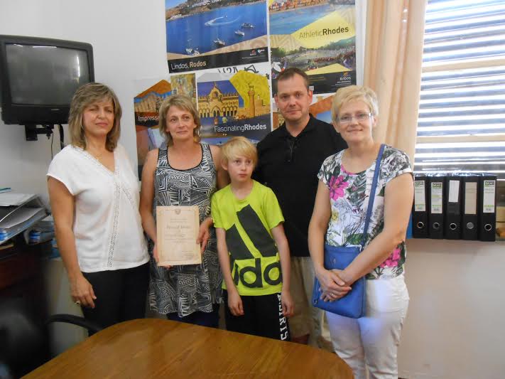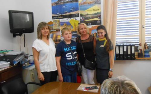 · Στην κυρία Paiivi Karvinen, στον κύριο Marko Kalmari και στον κύριο Aleksi Kalmari από τη Φινλανδία που φέτος βρίσκονται στη Ρόδο για 20η, 12η και 10η φορά αντίστοιχα. Την οικογένεια Kalmari – Karvinen συνόδευσε στο Δημαρχείο η συγγενική τους οικογένεια Εμμανουήλ Κάβουρα που διαμένει μόνιμα στη Ρόδο.