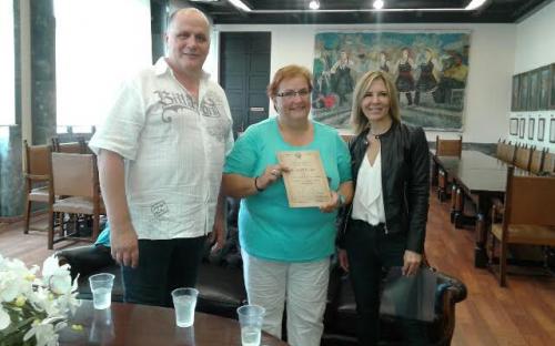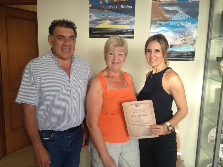 · Στην κυρία Kathleen Saunders από τη Μεγάλη Βρετανία που διαμένει στο ξενοδοχείο «Kassandra Hotel» και φέτος βρίσκεται στη Ρόδο για 40η φορά. Την κυρία Saunders συνόδευσε στο Δημαρχείο ο ξενοδόχος κύριος Εμμανουήλ Ζαμπελλάκης.
