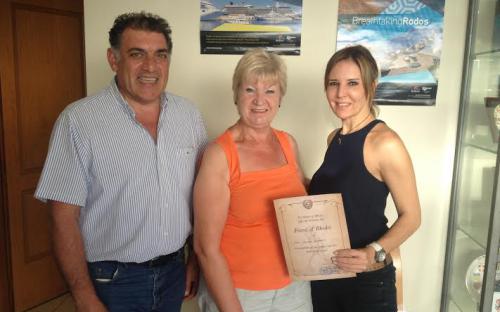 · Στην κυρία Gillian Edwards από τη Μεγάλη Βρετανία που διαμένει στο ξενοδοχείο «Continental Aparthotel» και φέτος βρίσκεται στη Ρόδο για 19η φορά.
