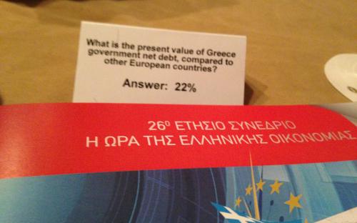 Paul B. Kazarian: Απλά απαντώντας στην ερώτηση: Ποια είναι η τρέχουσα αξία του ελληνικού καθαρού χρέους ως ποσοστό του ΑΕΠ; Μα το 22%! Είναι σημαντικό να δούμε πώς το υπολογίζουμε αυτό. Κι αυτό γιατί τα συγκεκριμένα νούμερα που το υπολογίζουν στο 170% του ΑΕΠ είναι τα μελλοντικά νούμερα, που για την Ελλάδα είναι σε 50 χρόνια από τώρα. Και πληρώνετε ελάχιστο τόκο για αυτό το χρέος και σε αυτό το διάστημα. Ο σωστός τρόπος υπολογισμού του χρέους – γιατί υπάρχει σωστός τρόπος σύμφωνος με ευρωπαϊκά και διεθνή πρότυπα – είναι ο υπολογισμός της τρέχουσας αξίας, δηλαδή οι τιμές που ισχύουν σήμερα.