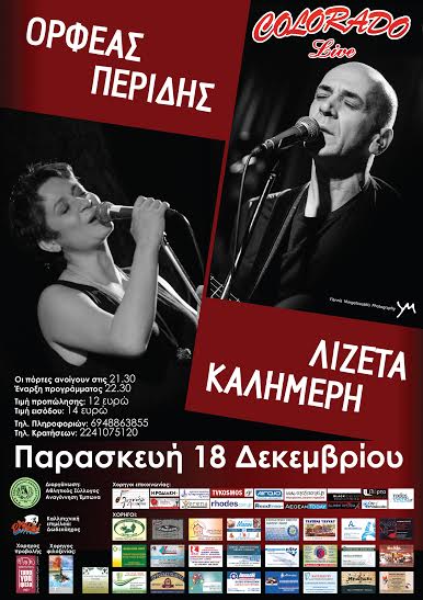 Την Παρασκευή 18 Δεκεμβρίου η μεγάλη συναυλια του Ορφέα Περίδη και της Λιζέτας Καλημέρη στο Colorado!!
