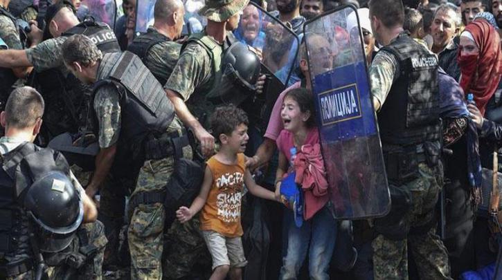 Η συγκλονιστική αυτή φωτογραφία του Georgi Licovski, από το European Pressphoto Agency (EPA), τραβήχτηκε στις 21 Αύγουστου του 2015. Ο Licovski δήλωσε ότι δεν ήταν εύκολο να φωτογραφήσει αυτούς τους ανθρώπους που είχαν χάσει τα πάντα. «Για να «μαλακώσουν τις αντιδράσεις των συνοριακών στρατευμάτων, οι απελπισμένοι πρόσφυγες έστελναν τα παιδιά τους στην πρώτη σειρά.