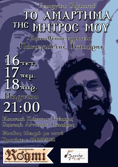 Το θεατρικό έργο «Το αμάρτημα της μητρός μου» του Γεωργίου Βιζυηνού, θα παρουσιαστεί από την Τετάρτη 16 έως και Παρασκευή 18 Μαρτίου στις 21:00 το βράδυ στη Ρωγμή του Χρόνου στην Παλιά Πόλη της Ρόδου.