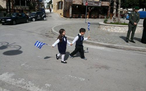 Η ελληνική σημαία, στηρίχθηκε από χέρια τρυφερά, χέρια μικρών μαθητών, με βλέμμα που προδίδει αποφασιστικότητα για προστασία των ιδανικών μας.