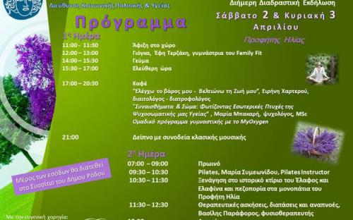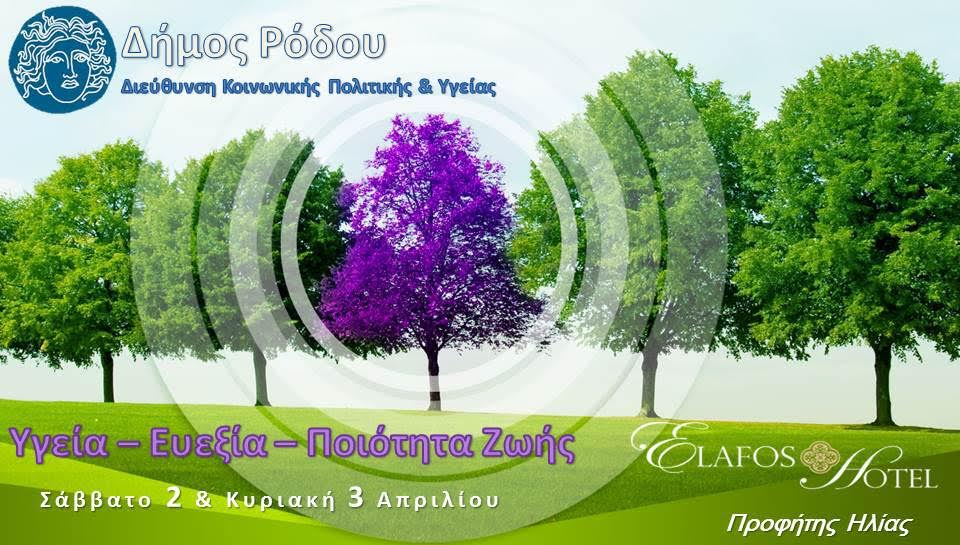 Ο Δήμος Ρόδου με τη Διεύθυνση Κοινωνικής Πολιτικής & Υγείας έχει τη χαρά να σας προσκαλέσει στη 2η Διήμερη Διαδραστική Εκδήλωση με τίτλο «Υγεία – Ευεξία – Ποιότητα Ζωής» που θα πραγματοποιηθεί το Σάββατο 2 και την Κυριακή 3 Απριλίου στο ξενοδοχείο Έλαφος στον Προφήτη Ηλία. Η διημερίδα θα πραγματοποιηθεί με τη μέριμνα της κ. Άννας Ζωάννου, Αντιδήμαρχο Προστασίας και Προαγωγής Υγείας, Κοινωνικής Πολιτικής, Ισότητας των φύλων και τρίτης ηλικίας.