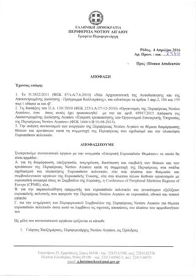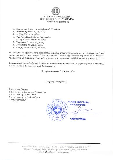 Στην σύσταση Επιτροπής Ευρωπαϊκών Θεμάτων προέβη ο Περιφερειάρχης Νοτίου Αιγαίου κ. Γιώργος Χατζημάρκος, με απόφαση που υπέγραψε πριν αναχωρήσει για τις Ηνωμένες Πολιτείες.