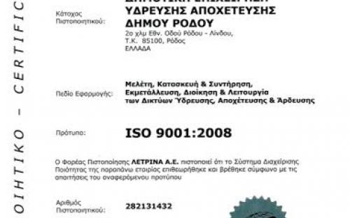 Με στοχευμένες κινήσεις η διοίκηση της ΔΕΥΑΡ, κατόρθωσε να επιτύχει την πιστοποίηση κατά το πρότυπο ISO -9001 :2008 με πεδίο εφαρμογής πιστοποίησης, την μελέτη κατασκευής, συντήρησης, εκμετάλλευσης, διοίκησης και λειτουργίας των δικτύων ύδρευσης- αποχέτευσης και άρδευσης. Η ημερομηνία έκδοσης του πιστοποιητικού είναι η 6ηΑπριλίου και ημερομηνία λήξης η 14η Σεπτεμβρίου του 2018.