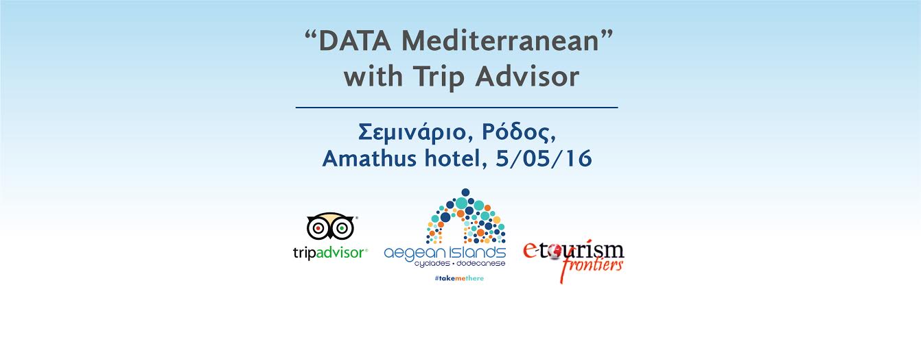 Μεγάλο ενδιαφέρον υπάρχει για το σεμινάριο ψηφιακού μάρκετινγκ «DATA MEDITERRANEAN» with Trip Advisor. Θα πραγματοποιηθεί στις 5 Μαίου 2016, στο ξεν/χείο Amathus με τη συνδιοργάνωση της Περιφέρειας Νοτίου Αιγαίου και του E-Tourism Frontiers. Οι θέσεις έχουν ήδη κλείσει μετά από ζήτηση στελεχών ξεν/χείων, τουριστικών επιχειρήσεων, ξενοδόχων και ιδιοκτητών μικρών καταλυμάτων, εμπόρων, από το χώρο των ψηφιακών υπηρεσιών, την τοπική αυτοδιοίκηση κλπ.