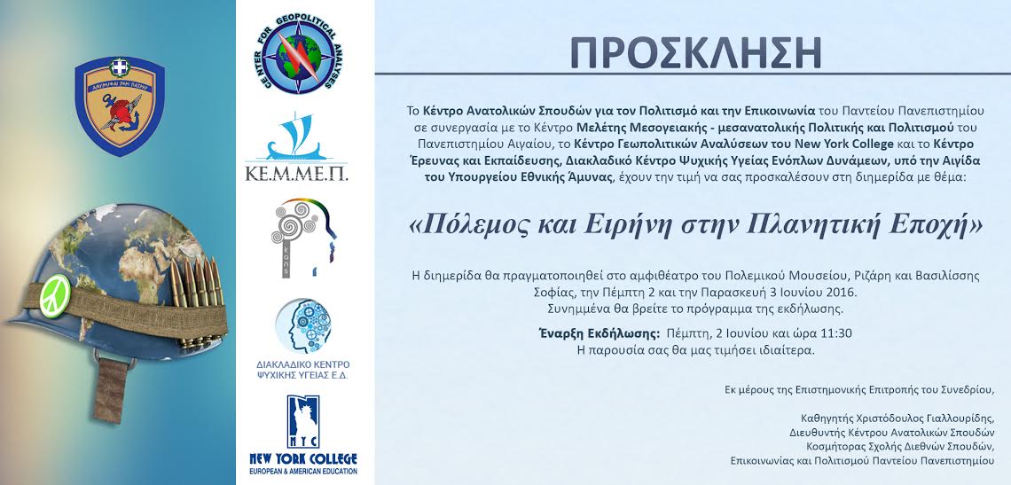 Το Κέντρο Ανατολικών Σπουδών για τον Πολιτισμό και την Επικοινωνία του Παντείου Πανεπιστημίου σε συνεργασία με το Κέντρο Μελέτης Μεσογειακής - μεσανατολικής Πολιτικής και Πολιτισμού του Πανεπιστημίου Αιγαίου, το Κέντρο Γεωπολιτικών Αναλύσεων του New York College και το Κέντρο Έρευνας και Εκπαίδευσης, Διακλαδικό Κέντρο Ψυχικής Υγείας Ενόπλων Δυνάμεων, υπό την αιγίδα του Υπουργείου Εθνικής Άμυνας, διοργανώνει διημερίδα με θέμα: