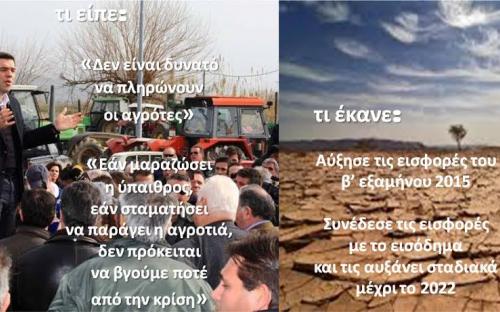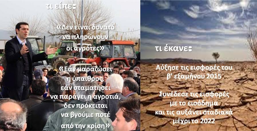 «Δεν είναι δυνατό να πληρώνουν οι αγρότες», «Εάν μαραζώσει η ύπαιθρος, εάν σταματήσει να παράγει η αγροτιά, δεν πρόκειται να βγούμε ποτέ από την κρίση». Μεγάλα λόγια, εύηχα, αλλά κυρίως χωρίς αντίκρισμα. Αυτές ήταν μόνο μερικές από τις φρούδες υποσχέσεις του λαοπλάνου Αλέξη Τσίπρα, του σημερινού πρωθυπουργού. Του ανθρώπου που μοίραζε απλόχερα υποσχέσεις, έσπειρε ανέμους και θερίζει θύελλες.