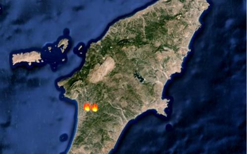 Χάρτης της Ρόδου που συνέλεξε ο αναγνώστης της "Ροδιακής" Γιάννης Δραβίλας από το πρόγραμμα Modis της NASA, στon οποίo αποτυπώνονται τα δύο μεγάλα πύρινα μέτωπα στη Νότια Ρόδο.