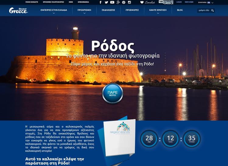Υπενθυμίζεται ότι η Ρόδος «πρωταγωνιστεί» στην κεντρική σελίδα του portal Discovergreece.com ως «Καμπάνια του μήνα», από τις 7 Ιουνίου και για ένα ολόκληρο μήνα, προβάλλοντας την Ρόδο και στοχεύοντας στην ενίσχυση των κρατήσεων από τις σημαντικότερες τουριστικές αγορές και πολύ περισσότερο από τις αγορές που παρουσίασαν πτώση τον Μάιο, όπως η Αγγλία, η Γαλλία, η Ολλανδία και η Νορβηγία. Τέλος, η καμπάνια της Ρόδου ενισχύεται με την υλοποίηση αποκλειστικού διαγωνισμού, που στοχεύει στην ενεργή συμμετοχή του κοινού και της προβολής της Ρόδου με εύκολο και δημιουργικό τρόπο.