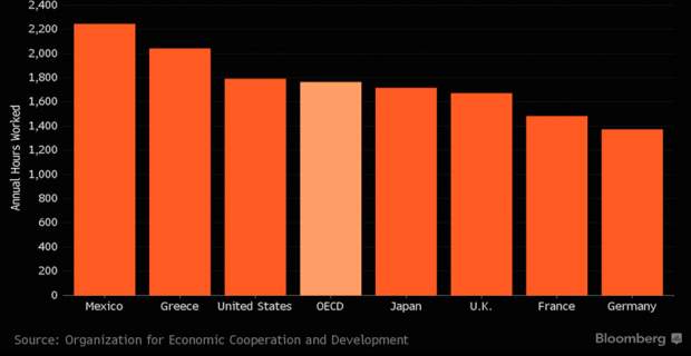 Συγκεκριμένα, και σύμφωνα με έρευνα του ΟΟΣΑ που δημοσιεύει το Bloomberg, οι δύο από τους τρεις λαούς που δούλεψαν τις περισσότερες ώρες το 2015 ήταν οι Μεξικάνοι και οι Ελληνες, ενώ εκείνοι που έγραψαν στο κοντέρ τους τις λιγότερες ώρες εργασίας ήταν οι Γερμανοί.