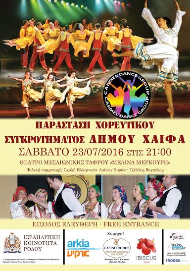 Το Σάββατο, 23 Ιουλίου 2016, στις 21:00 παρουσιάζει σε μία μοναδική παράσταση στο Θέατρο Μεσαιωνικής Τάφρου "Μελίνα Μερκούρη" το συγκρότημα παραδοσιακών χορών του Δήμου της Χάιφα, Ισραήλ. Το χορευτικό συγκρότημα του Δήμου της Χάιφα «Halleluya Dance Group» αποτελείται από χορευτές που είναι φοιτητές, βετεράνοι χορευτές των νεανικών συγκροτημάτων. Το ρεπερτόριο του θιάσου αντανακλά την πλούσια λαογραφία που προέρχεται από τον ισραηλινό κοινωνικό ιστό - ένα επιτυχημένο συνδυασμό της μοναδικής λαογραφίας των κοινοτήτων της, μαζί με χαρακτηριστικά του σύγχρονου ισραηλινού χορού. Ο Barry Avidan είναι ο χορογράφος και καλλιτεχνικός Διευθυντής της ομάδας και η Zahava Tabero.