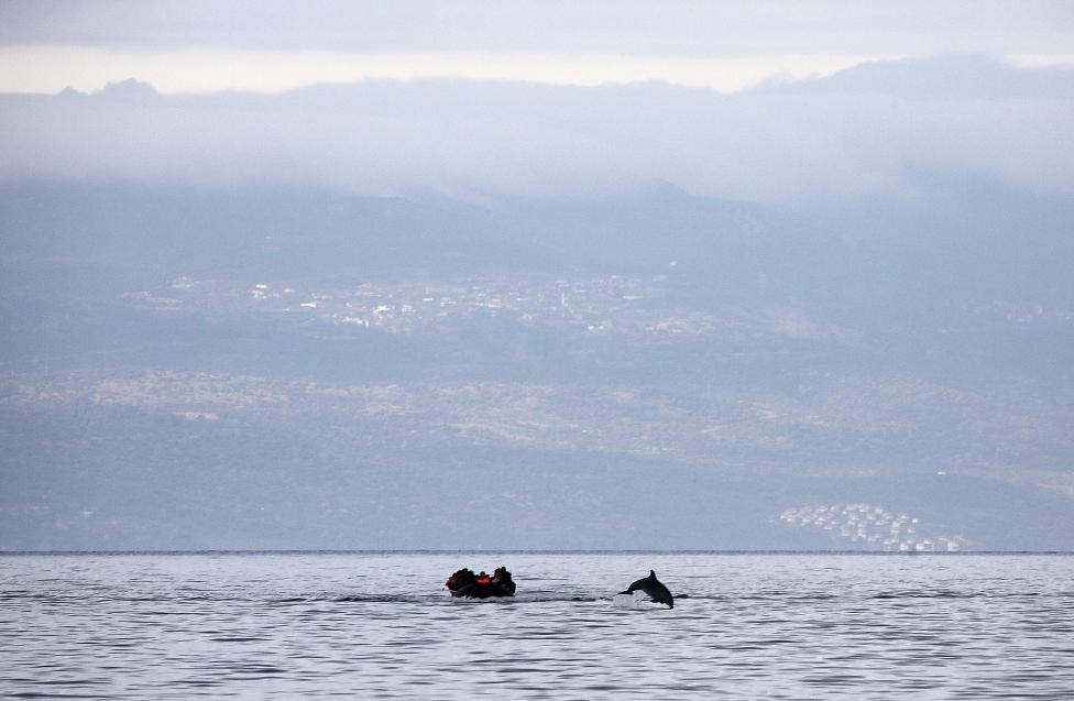 Ένα δελφίνι πηδά τα κύματα μπροστά σε ένα πλωτό σκάφος γεμάτο πρόσφυγες από τη Συρία. Έρχονται από την Τουρκία, που φαίνεται στο φόντο, και προσπαθούν να φτάσουν στη Λέσβο. Μια εκπληκτική φωτογραφία του Γιάννη Μπεχράκη για το Reuters.