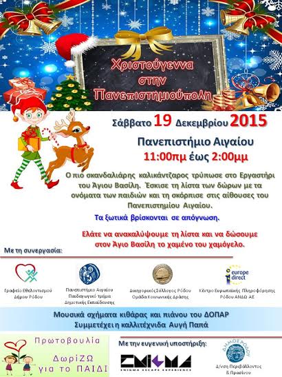 Την Κυριακή 20/12/2015 και ώρα 11:00 έως 17:00 στις αθλητικές εγκαταστάσεις ποδοσφαίρου του Πανεπιστήμιου Αιγαίου  θα πραγματοποιηθούν φιλανθρωπικοί Ποδοσφαιρικοί Αγώνες 8Χ8 ενώ ταυτόχρονα θα υπάρχουν πολλά όμορφα χριστουγεννιάτικα events για μικρούς και μεγάλους.