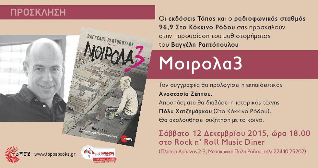 Οι εκδόσεις Τόπος και ο ραδιοφωνικός σταθμός Στο Κόκκινο Ρόδου 96.9 σας προσκαλούν στην παρουσίαση του μυθιστορήματος του Βαγγέλη Ραπτόπουλου "Μοιρολα3".