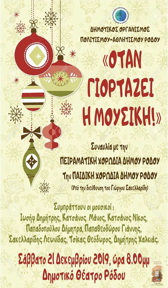 Ο Δημοτικός Οργανισμός Πολιτισμού- Αθλητισμού Ρόδου με μια συναυλία εγκαινιάζει το πρόγραμμα των εκδηλώσεων για τις ημέρες των εορτών.