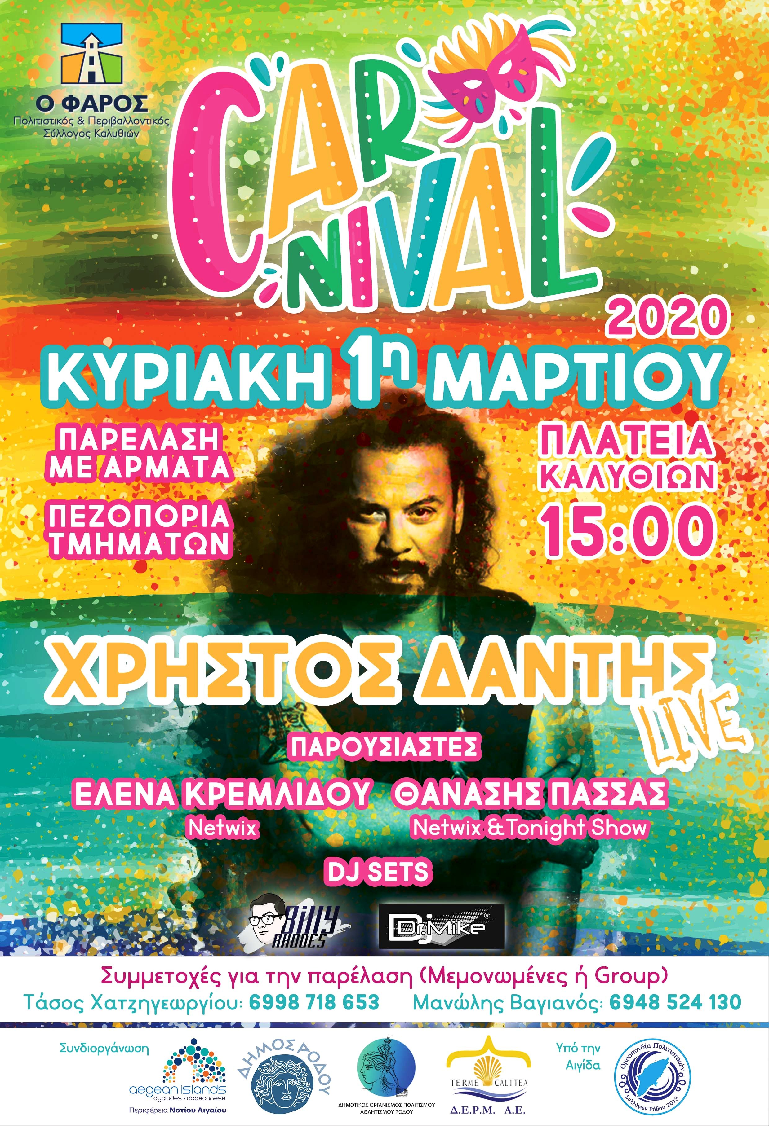 Ο Πολιτιστικός Σύλλογος Καλυθιών «Ο Φάρος» σας προσκαλεί, την Κυριακή 1η Μαρτίου στις 15:00 το μεσημέρι, στην πλατεία των Καλυθιών, να θαυμάσετε 15 Καρναβαλικές δημιουργίες από την Πάτρα και να διασκεδάσετε με την ζωντανή συναυλία του Χρήστου Δάντη.